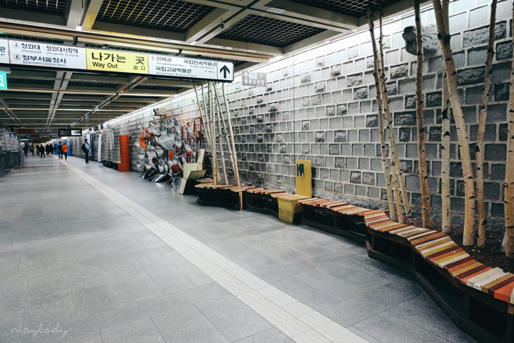 เรานั่งซับเวย์ไปลงสถานี Gyeongbokgung ออกทางออก 4 แล้วเดินเลาะกำแพงพระราชวังมาเรื่อยๆค่ะ