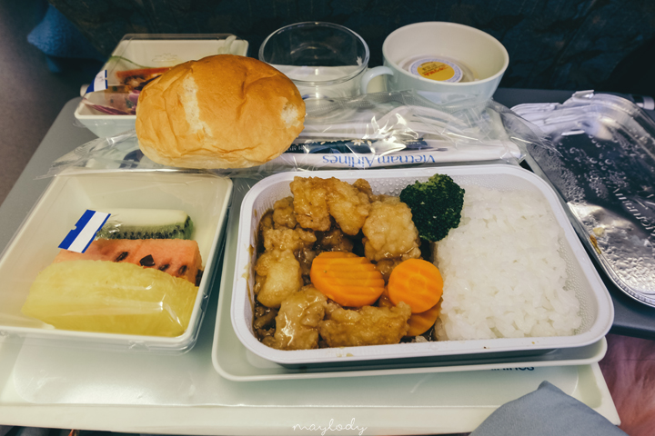 ขึ้นเครื่องมาก็ได้รับอาหารมาทาน เรานั่งติดหน้าต่าง ข้างๆเป็นคู่สามีภรรยาชาวยุโรป